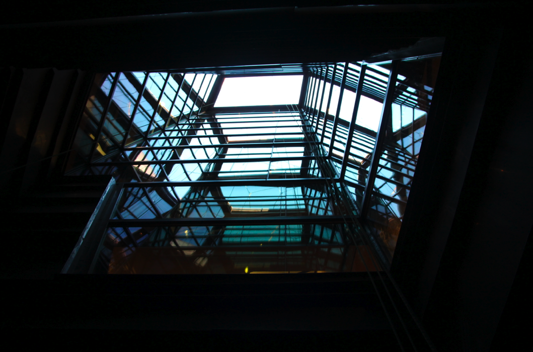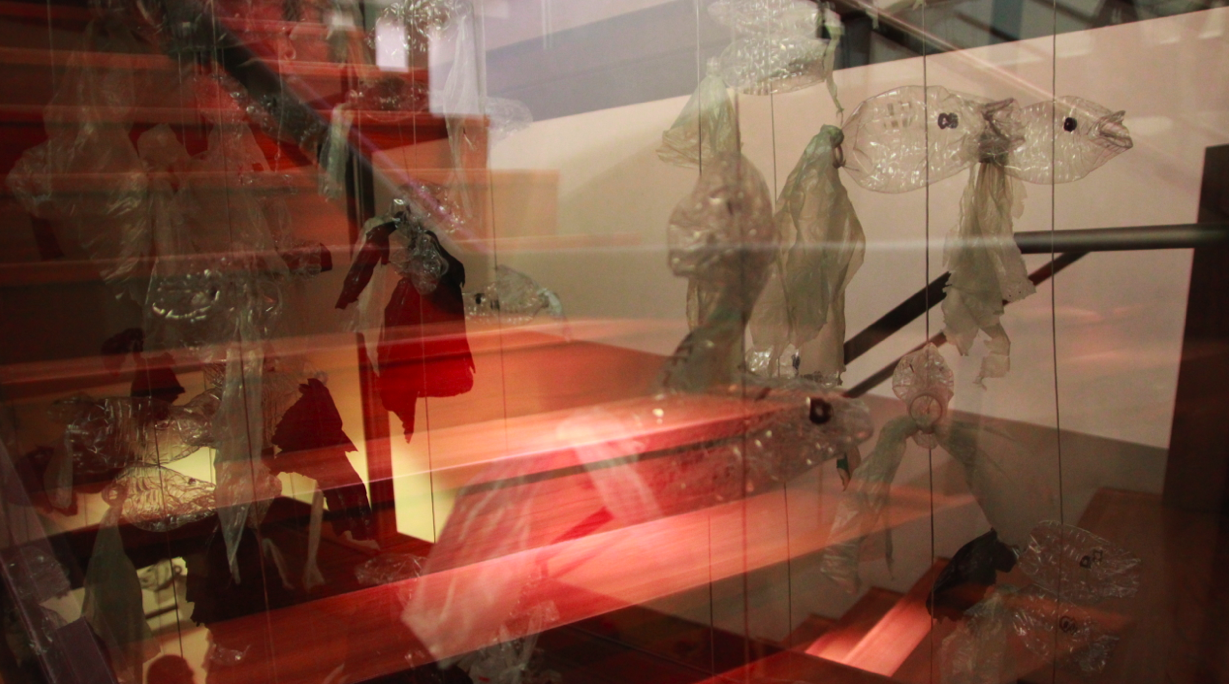 The installation is vertically suspended in the Campus Center, in a space called the Impluvium. The Impluvium is a 12’x4’ wide vertical glass channel, that spans from the roof of the building to the basement, 63’ in height. It is open to the sky on the top, so rain and snow can fall through, and it acts as the primary air draw for the building’s ventilation system. To get to the top floor of the Campus Center, people walk up stairs that circle around the Impluvium. This means people can see anything that goes through the space – rain, snow, occasional leaves, and now strings of clustered (“schooling”) plastic PET bottles evolving into plastic fish.