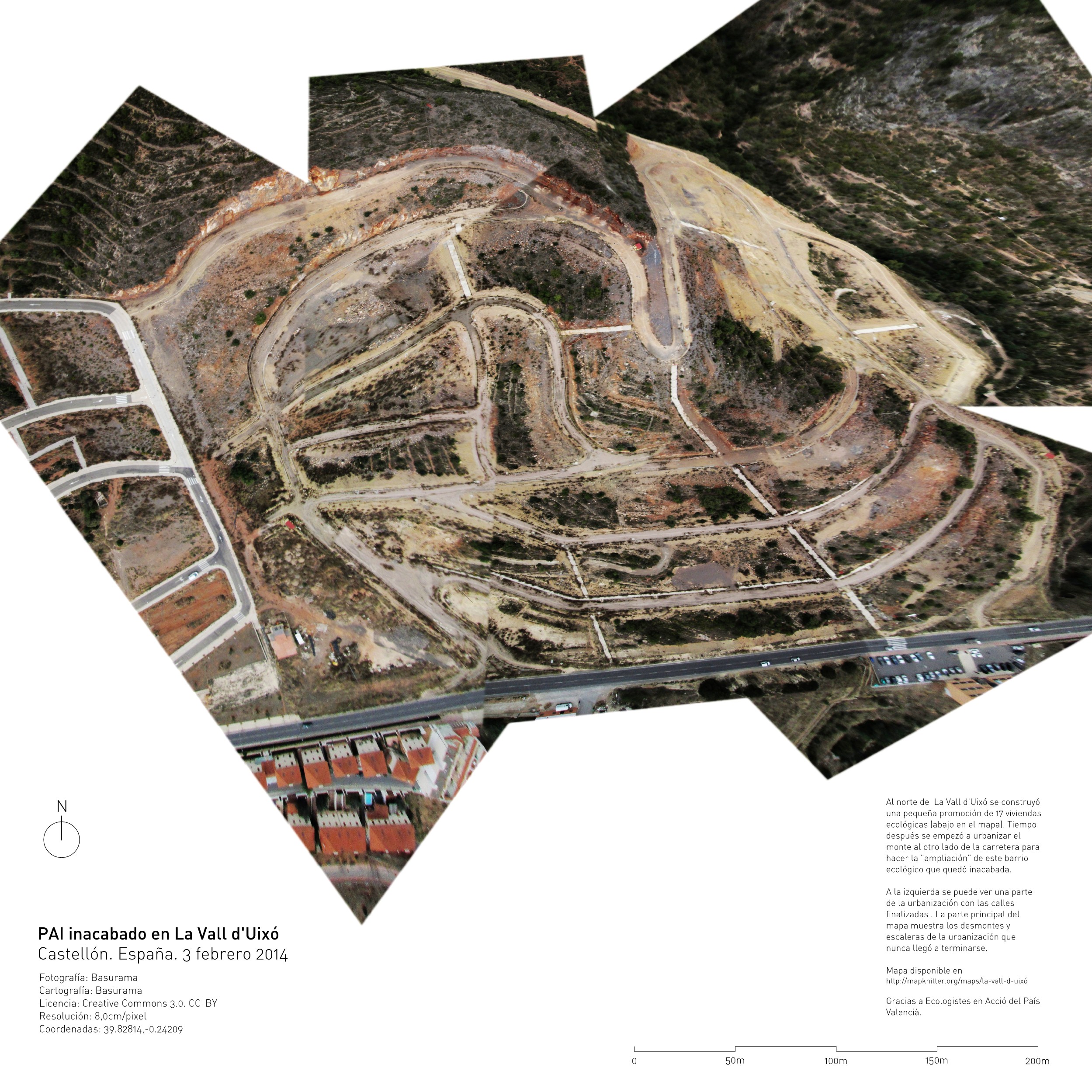 - A new residential area was going to be built, but it got stopped and left a “broken” mountain at the north of La Vall d’Uixó. Map available. The local group of Ecologistes en Acció is planning to use the photos for their mobilizations.