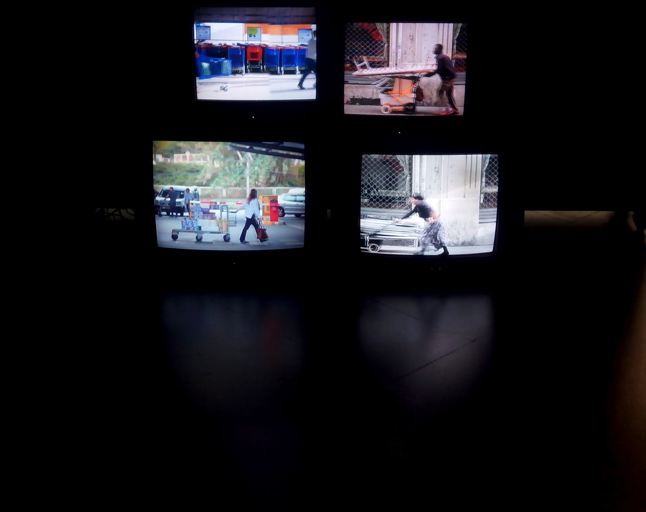Chainwork Reverted researches the consumption/waste relationship by including its main actors and showing how the recyclers reverse the process to a certain extent. The video-installation shows how consumers transport their purchases in their shopping carts and how waste pickers carry the materials rescued from waste.